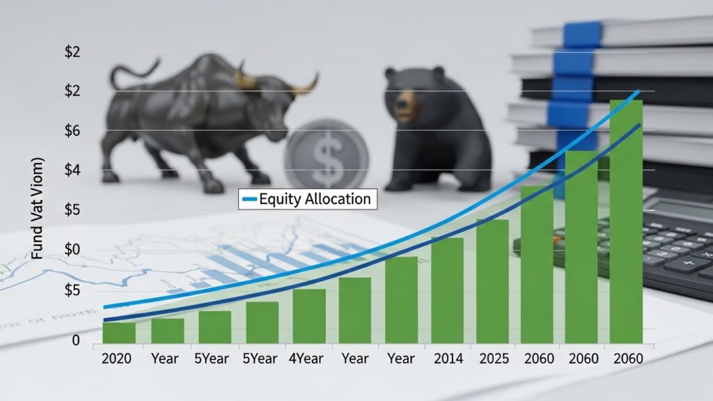투자가 어렵다면 TDF가 가장 좋은 대안입니다. TDF는 가입자의 은퇴 시점(Target Date)에 맞춰 자산 비중을 자동으로 조절해주는 펀드입니다. 젊을 때는 주식 비중을 높여 공격적으로 운용하고, 은퇴가 가까워지면 채권 비중을 높여 안전하게 관리해줍니다.